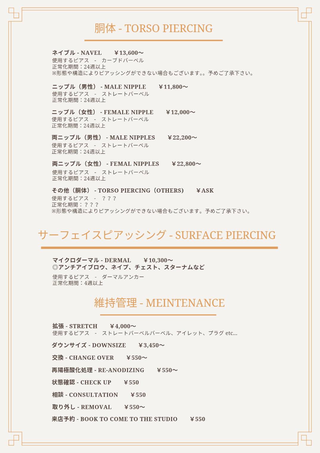 表記の金額は1箇所に対し、シンプルなピアッシングジュエリーを使用しての最低料金になります。