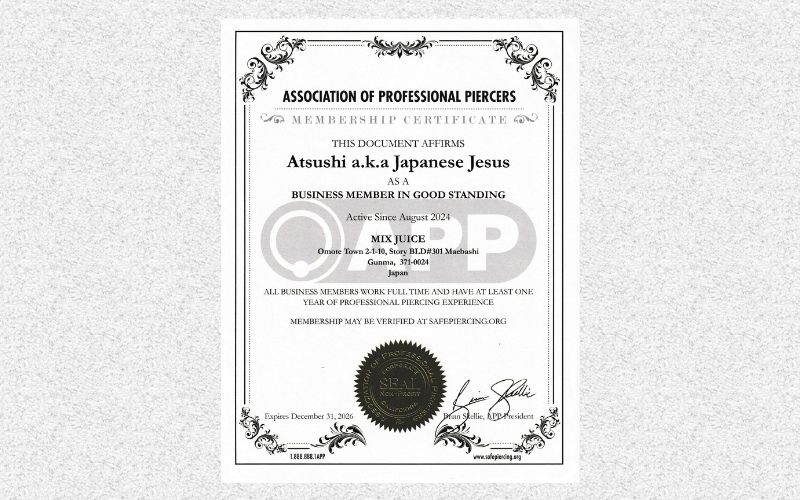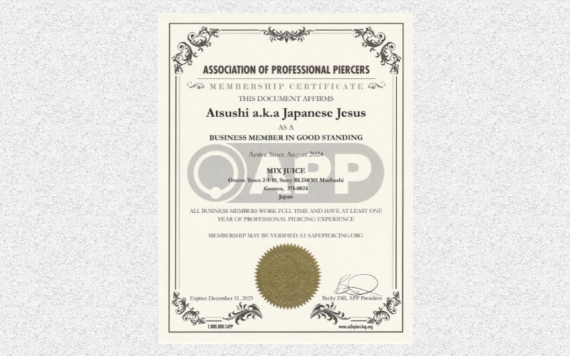 2014年,2015年,2018年にはボディーピアス先進国アメリカのラスベガスで行われたAPP(Association of Professional Piercer’s)の勉強会にも参加し、最先端の衛生管理と技術の知識を得る。